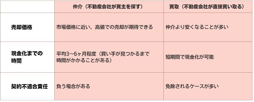 「仲介」は「買取」より高値が期待できますが、時間がかかる可能性があります。すぐに現金化したい、または修繕せずに現状のまま売りたい場合は「買取」を検討する手もあります。
