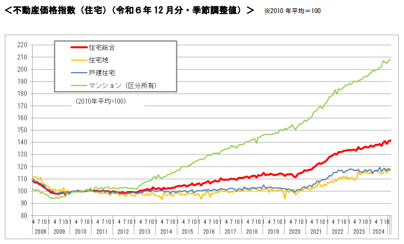 不動産価格は、経済情勢や金融政策、需給バランス、地域開発など多様な要因で変動しますが、国土交通省の不動産価格指数によると、マンション価格は2013年頃から一貫して上昇傾向が続いており、特に首都圏でその傾向が顕著です。全国のマンション価格指数は、2010年を100とした場合、2024年12月時点でほぼ2倍の水準に達しており、現在の売却相場は過去最高価格で推移している状況です。今後の見通しとしても、この価格高騰は継続すると考えられています。